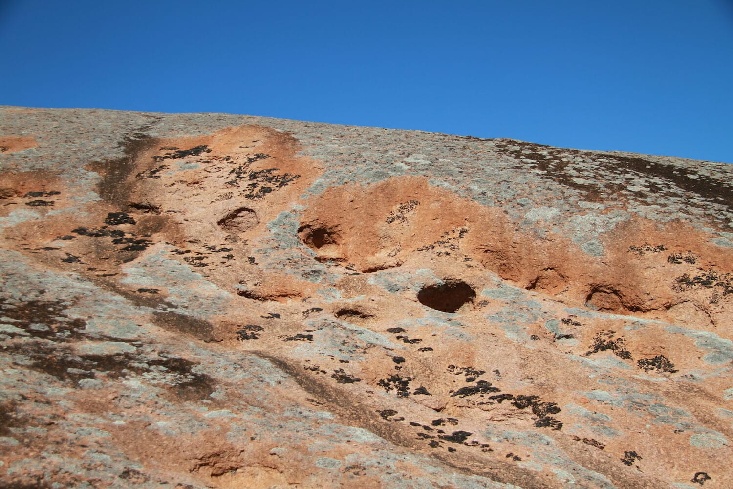 A gnamma is a rock hole capable of containing water. The word originated from the Nyungar native language of South Western Australia and is being applied across the country to various types of weathering pits. These occur mainly in granite and this part of the North Western Eyre Peninsula has numerous and varied examples on the inselbergs and rock outcrops of this granite country.
