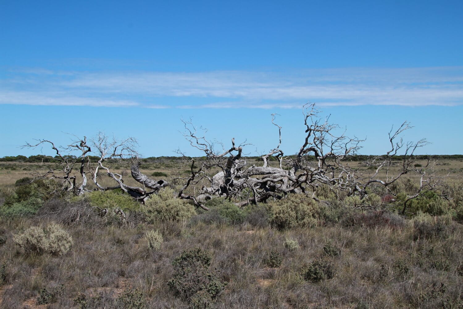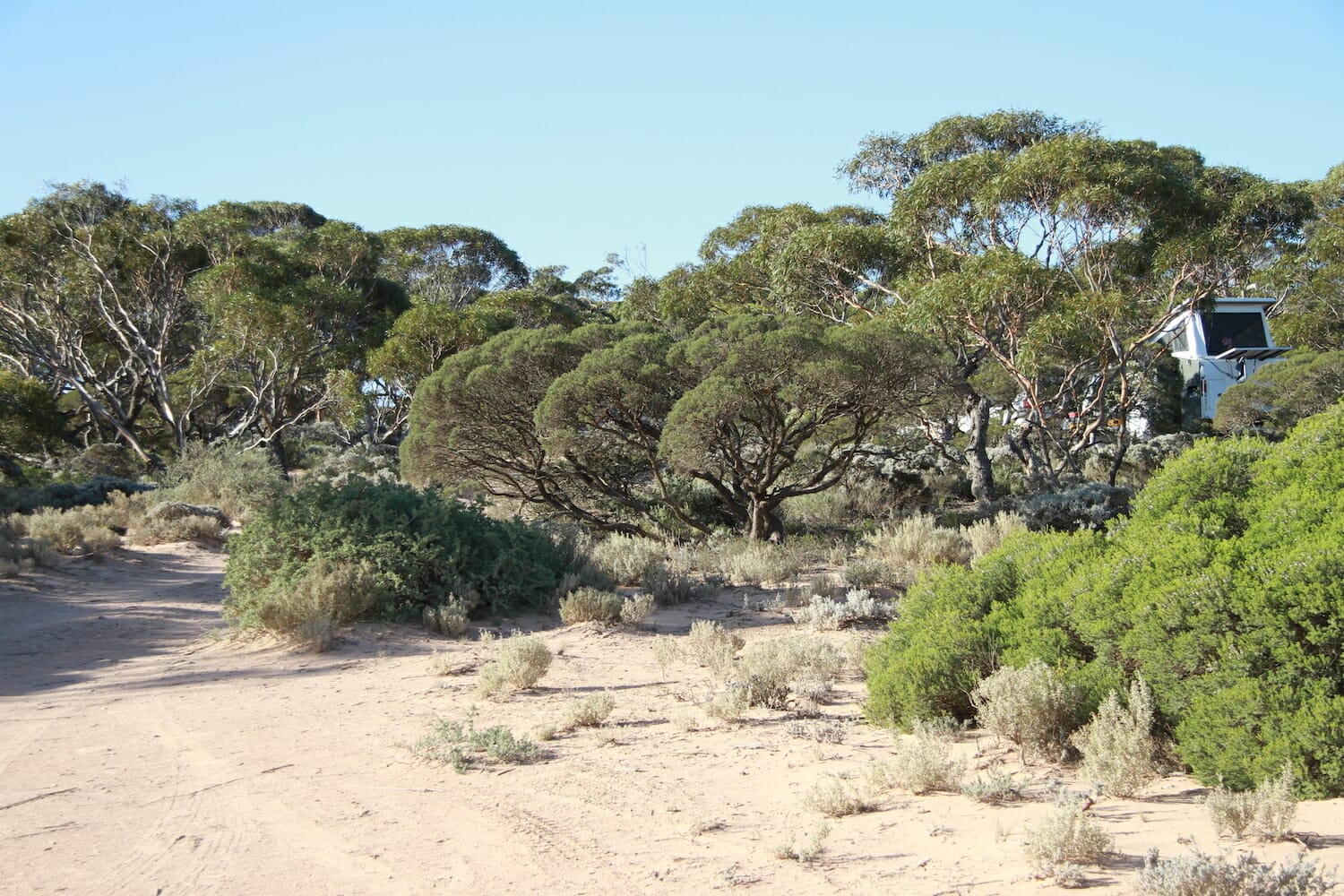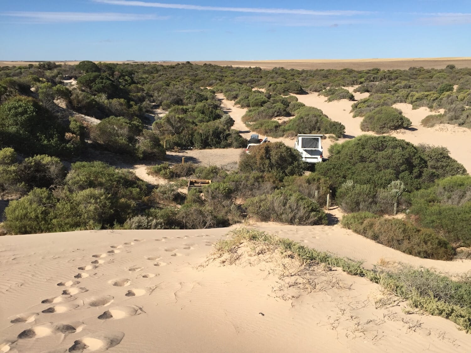 It’s called Rest Area 222km Peg, has 4 stars on WikiCamps and there are many tracks leading into the bush to tuck in to so we drove out the back onto a relatively flat sandy patch. You can just see the large sand dunes on the Great Australian Bight in the distance about 20Km away. Only a caravan and another car pulled in later near the entrance.