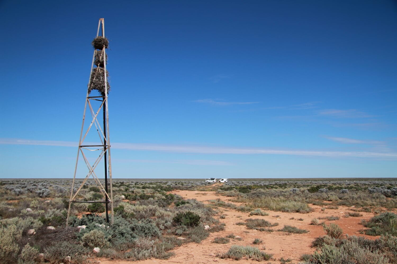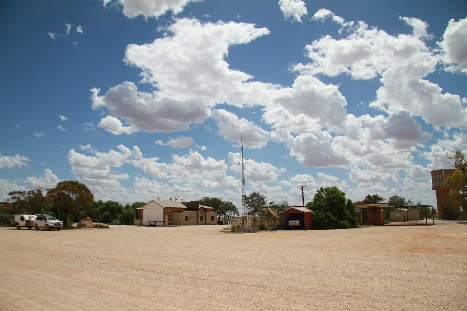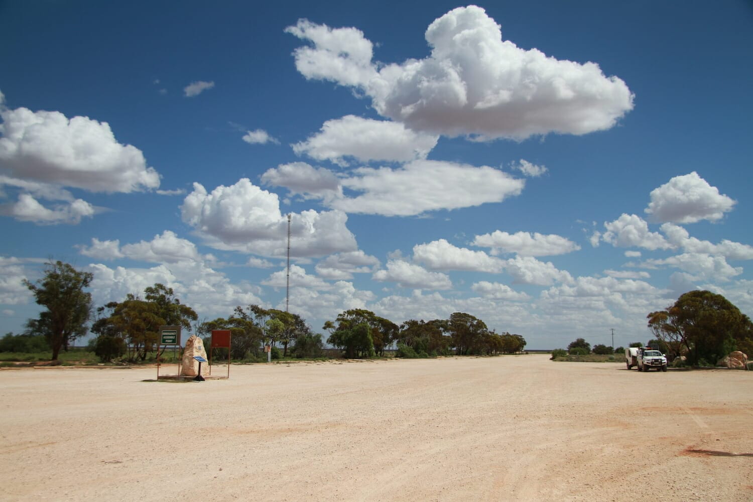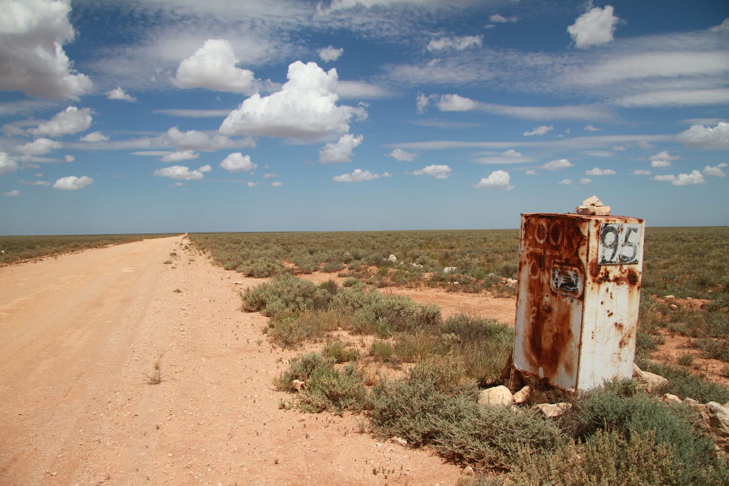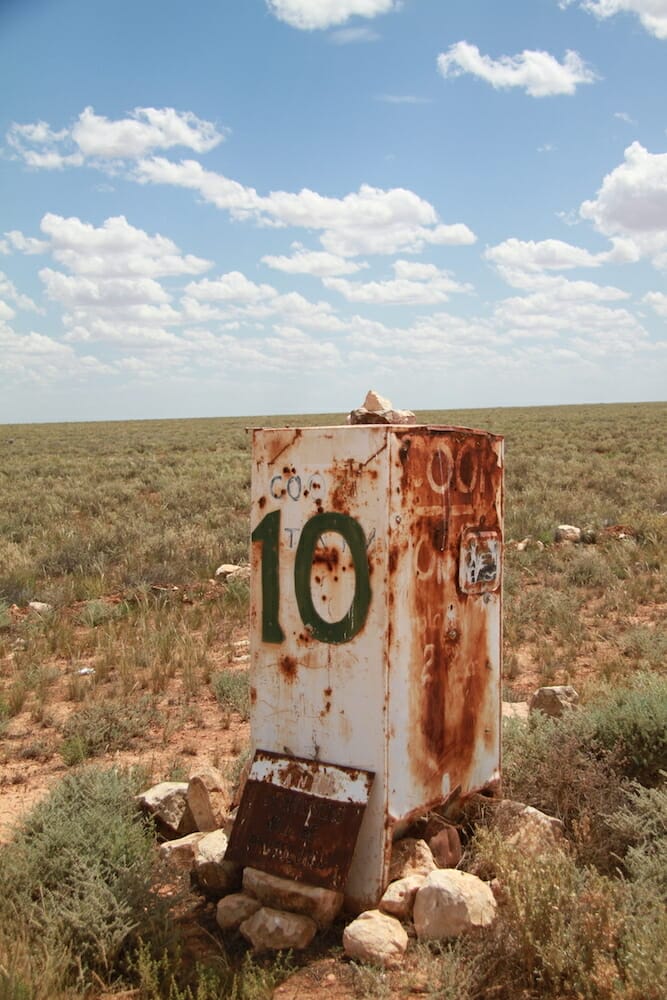 We didn’t meet any other vehicles along the way and it took about two hours because guess who kept stopping to take photos of the amazing saltbush landscape and distance markers, of which there were the old triangle post ones and the 10 Km marker on an old rusty steel cabinet. Eventually we saw signs of a building getting larger and larger in the road ahead of us with a large telecommunications tower on the left rising out of nowhere.