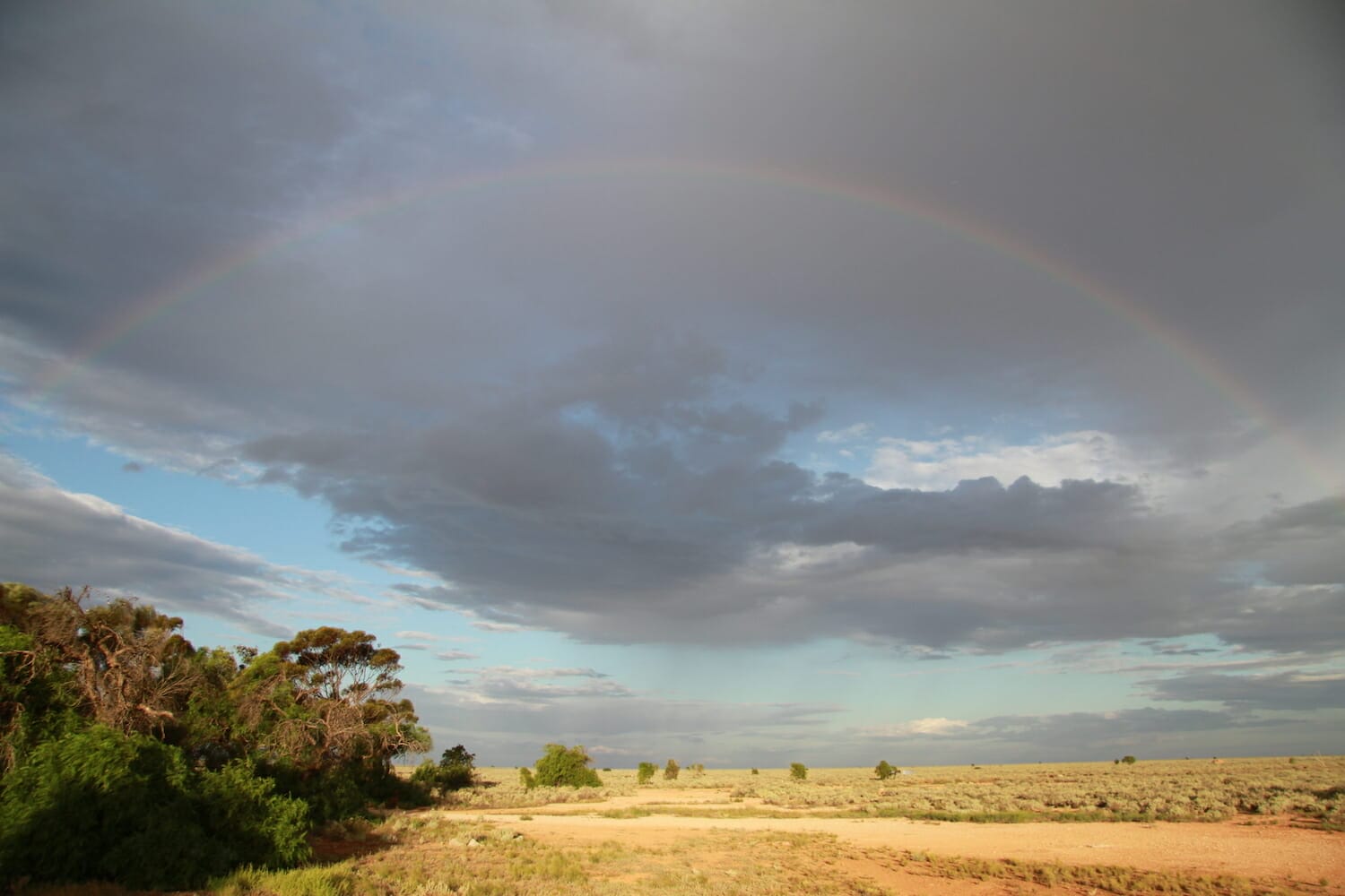 Not long after setting up, we heard the rumble of a freight train arriving from the west, so we rushed to the line to take a close look. After all, there’s not much else to do, and it’s what we came here for! It was the Pacific National NR2 arriving with a load of shipping containers. It stopped for about an hour then headed on its journey east. The different colours of the containers look great from a distance watching the train go through. Some storm clouds approached, and we witnessed a 180 degree rainbow over the saltbushes to the south.