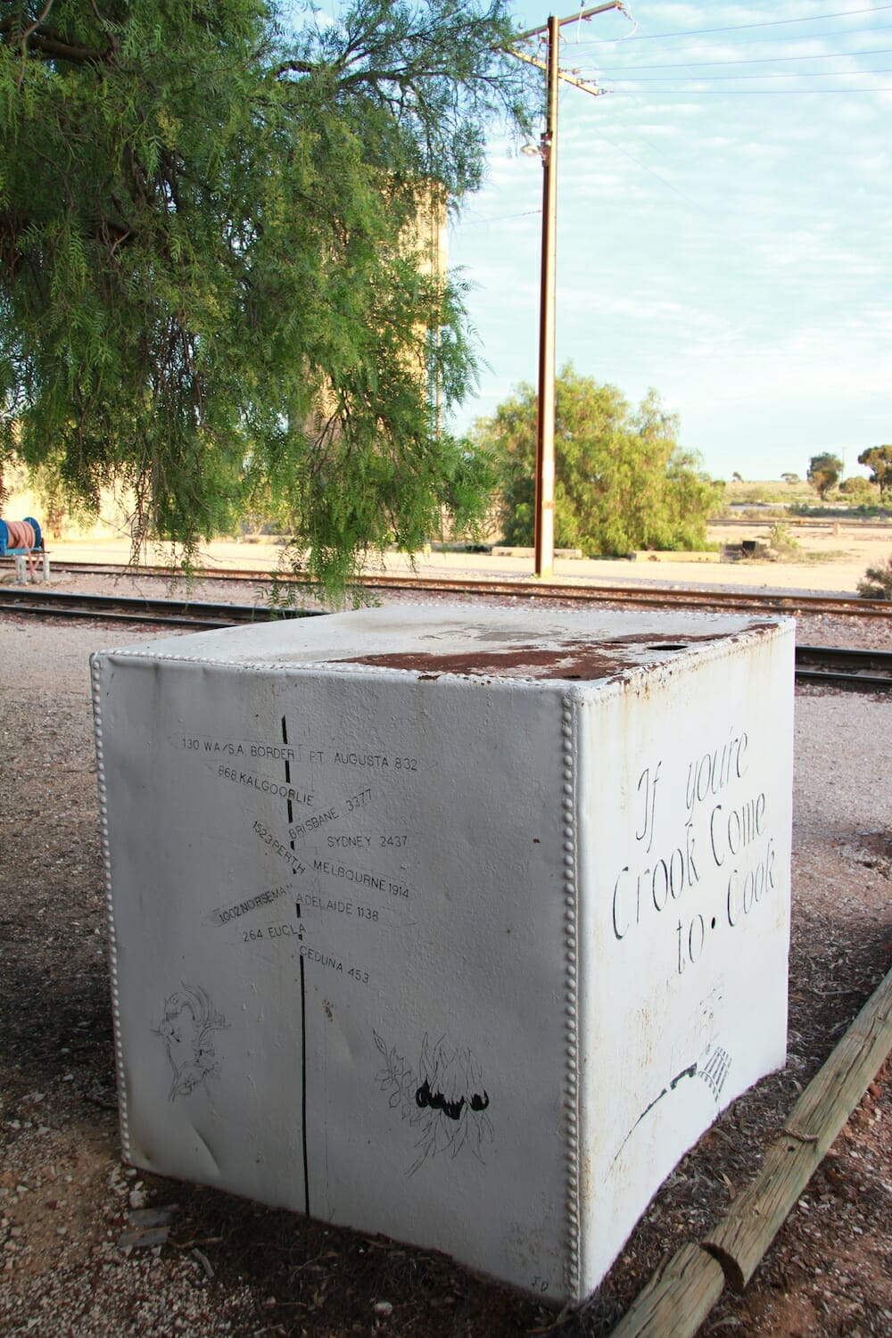 We asked the caretakers where the most appropriate place to park our camper would be and they said to go behind the old school, which was the building we saw in the distance when approaching the town. There is a toilet we could use next to the train line that is used by the passengers from the Indian Pacific when they stop. It was about 35C with a moderate to fresh wind which kept the flies at bay. We setup camp behind the school next to a couple of red ghost gum trees with a view towards the tower and train line to the west and the train line, town manager’s houses and dongas to the east.