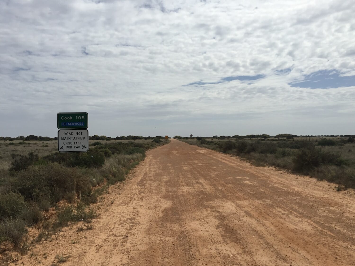 With Cook as our destination for the day, we left our roadside campsite and stopped at the Nullarbor Roadhouse to check on the road condition into Cook. The manager there didn’t know and hadn’t heard otherwise but said they’d been a lot of rain to the north. We decided to go as we could find no evidence of much rain around there, and like that was going to stop us! The price of fuel at the Roadhouse was $1.87/L. We didn’t need any as we had refuelled at Penong for $1.42/L and could do another 550Km.