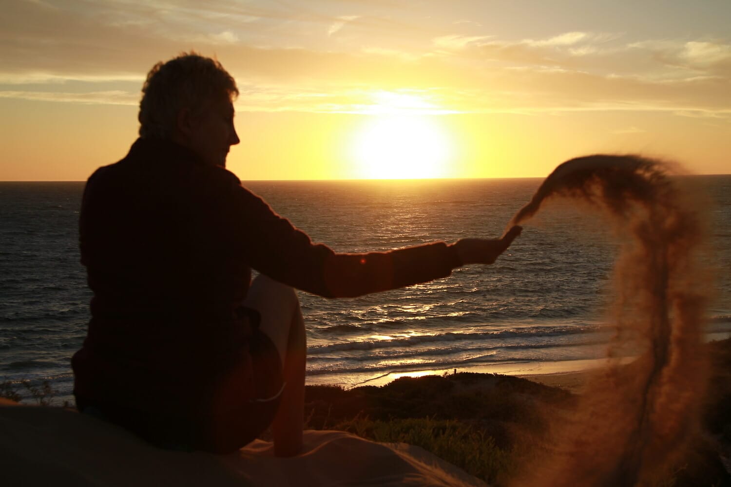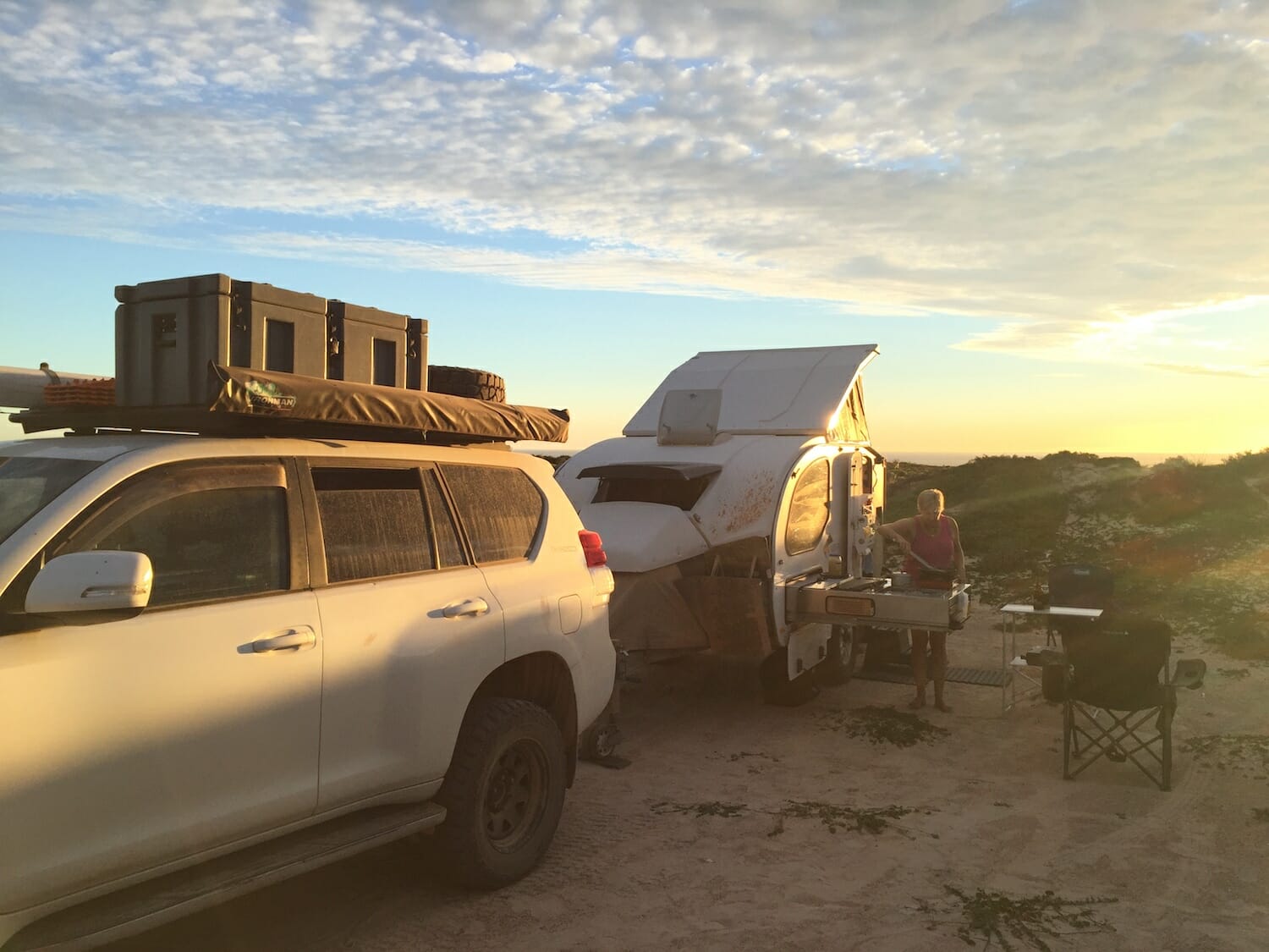 This campsite was perfect as there was a westerly wind blowing and the dunes shielded us nicely. We camped with the dunes near our door step, and could hear the roar of the waves pounding the shore over them. We love the sound of the sea, it’s so calming. If it’s really crashing, you can be too close as it’s deafening. We’ve also camped near fast running streams in the Victorian High Country that are so loud you need to move! Walking over the high, trodden free dunes you arrive at the top where you can see the waves crashing on the shore and magnificent views up and down the coast. We watched an awesome sunset from the top of the dunes and Vic drank his last Dainton beer left over from when we stayed at Kim and Leo’s.