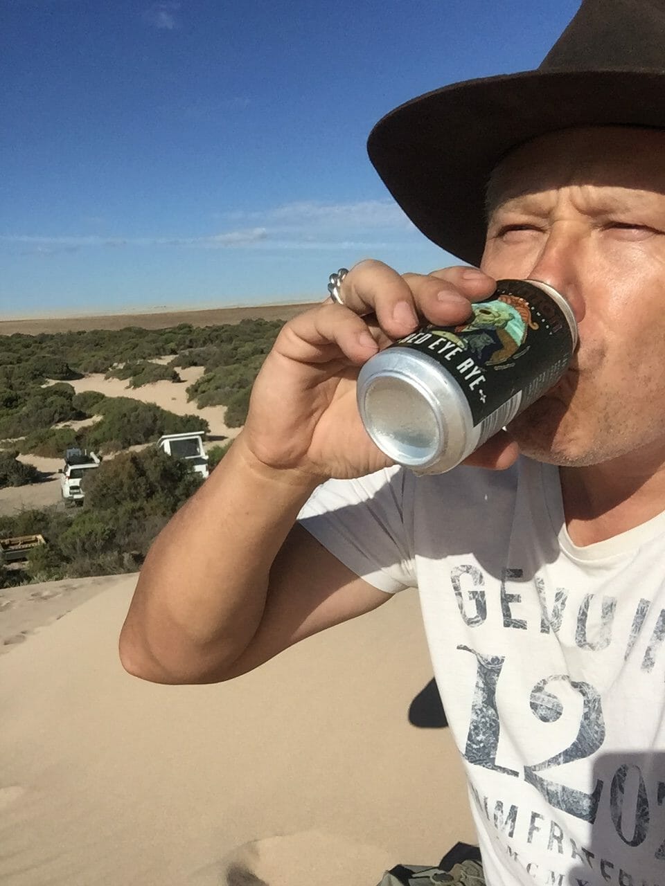 Vic opening his Coopers Craft Pale Ale on the Nullarbor
