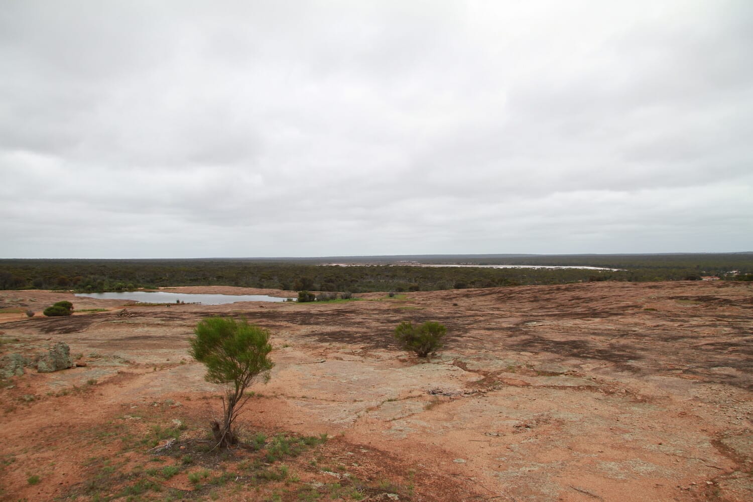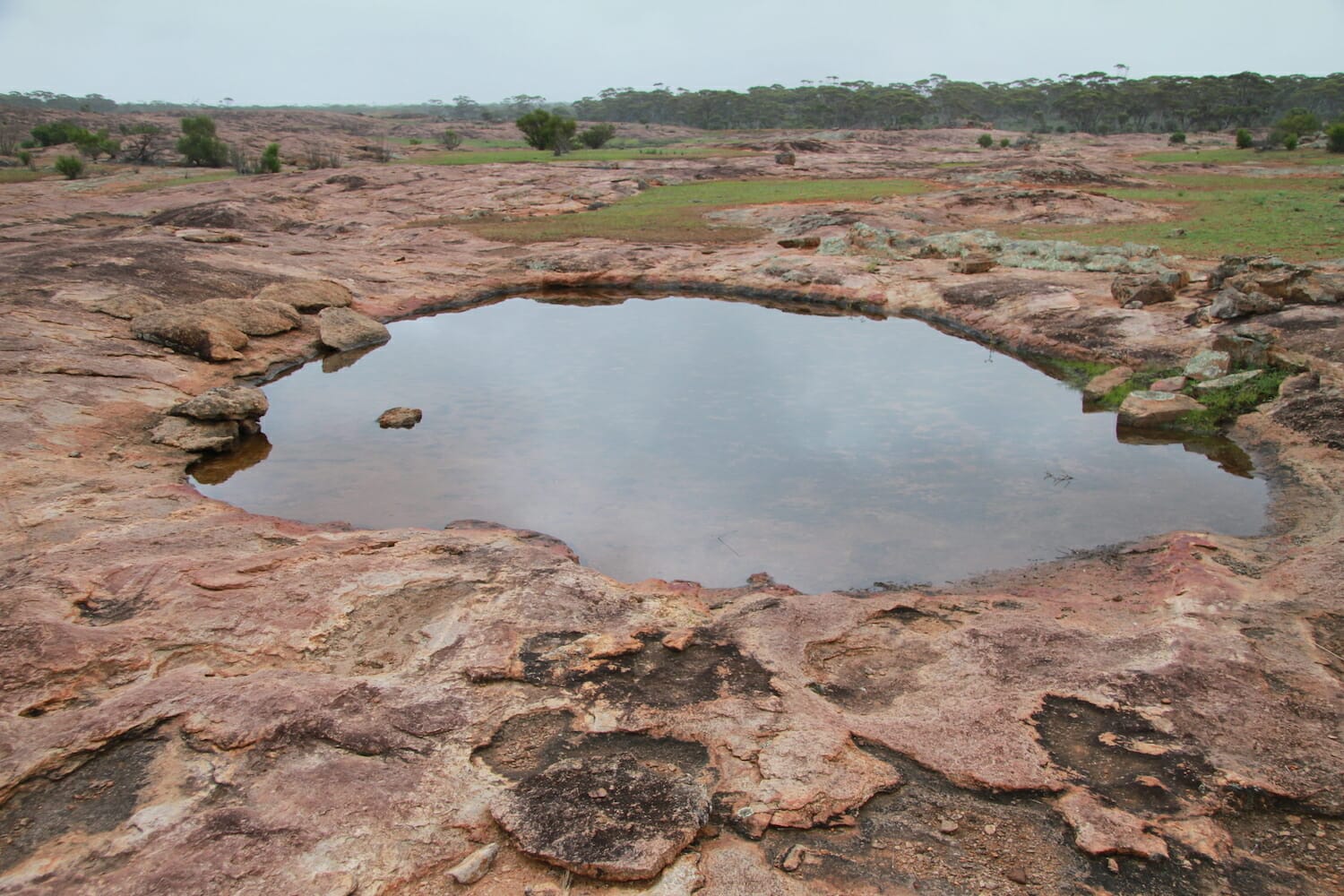 It wasn’t locked but it was closed so we drove through and closed it behind us. The track could be quite slippery in the rain. We drove up the narrow track, which was only a little damp from recent rain and after about 2 km came to the most amazing rock formation. It was not very high, but made of undulating red and brown granite. Getting out of the car we were hit with a very distinctive sweet odour which turned out to be from the sandalwood trees around. Water had pooled in numerous places around the rocks and we stopped near a large dam with a few ducks. There was no one else around, apart from some cows mooing in the distance but they never came near. We went for a walk and had this most beautiful place all to ourselves.