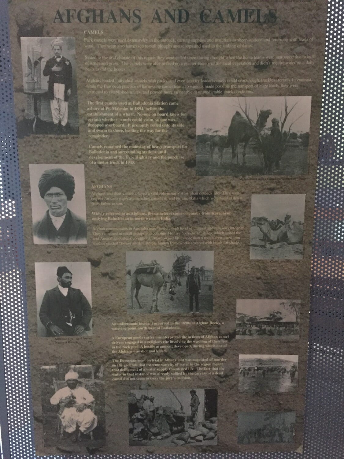 Known as “The incident at Afghan Rock”, it occurred at the very site we were camped. Taken from a poster at the museum is this account of it: “A European goods carter misinterpreted the actions of Afghan camel drivers engaged in a religious rite involving the washing of their feet in the rock pool. A hostile argument developed, during which one of the Afghans was shot and killed. The European went on trial in Albany, but was acquitted of murder on the grounds that extreme scarcity of water in the region meant that defilement of a water supply threatened life. The fact that the water in that instance was already sullied by the carcass of a dead camel did not seem to sway the jury’s decision”.