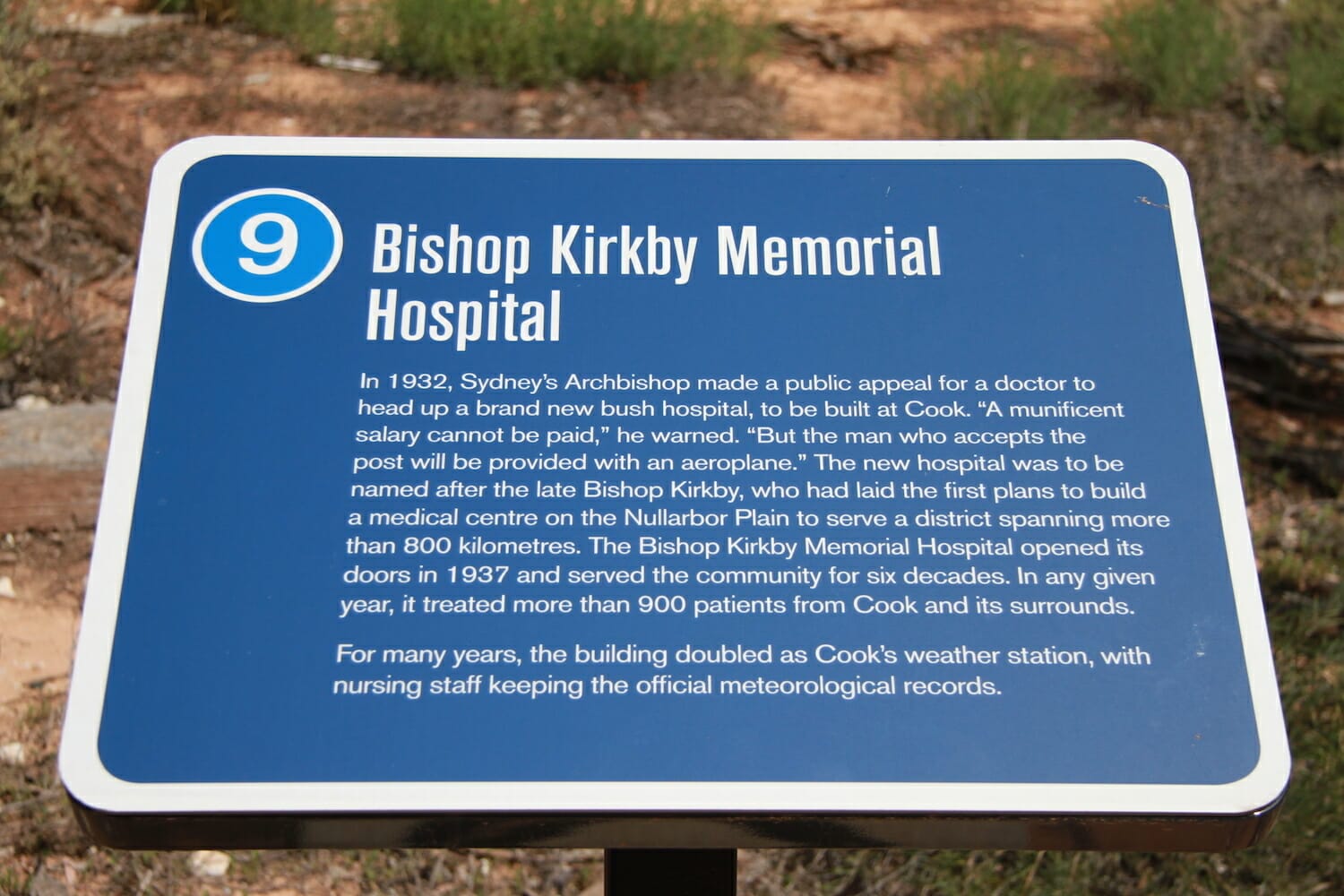 On the sign it read: In 1932, Sydney’s Archbishop made a public appeal for a doctor to head up a brand new bush hospital to be built at Cook. “A munificent salary cannot be paid,” he warned. “But the man who accepts the post will be provided with an aeroplane.” The new hospital was to be named after the late Bishop Kirkby, who had laid the first plans to build a medical centre on the Nullarbor Plain to serve a district spanning more than 800 kilometres. The Bishop Kirkby Memorial Hospital opened its doors in 1937 and served the community for six decades. In any given year, it treated more than 900 patients from Cook and its surrounds. For many years, the building doubled as Cook’s weather station, with nursing staff keeping the official meteorological records.