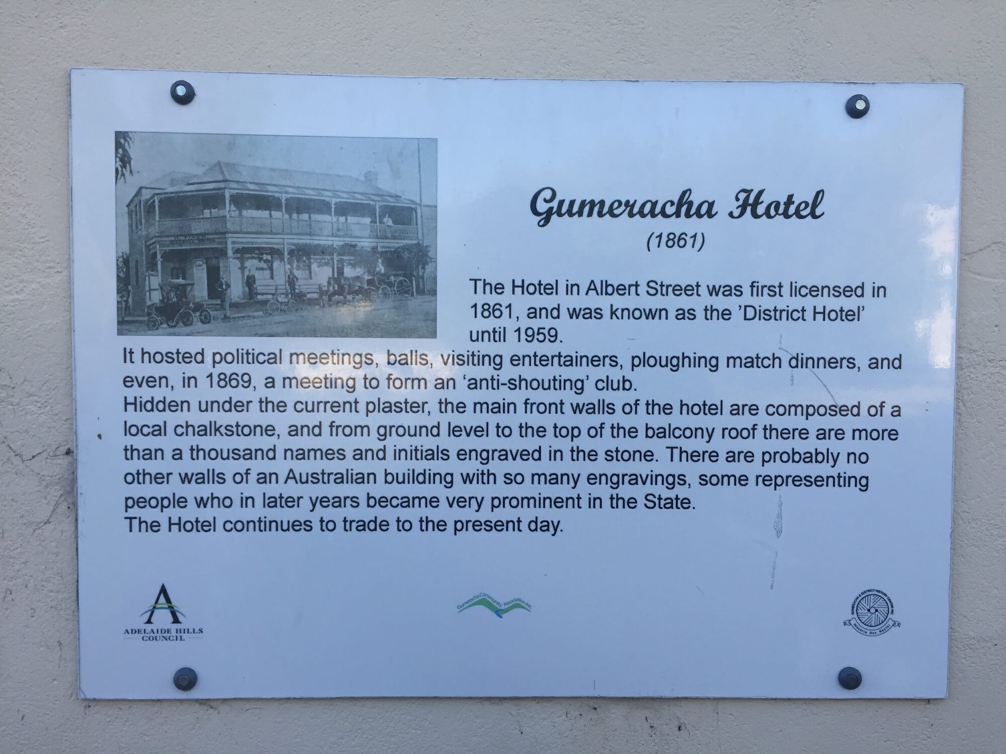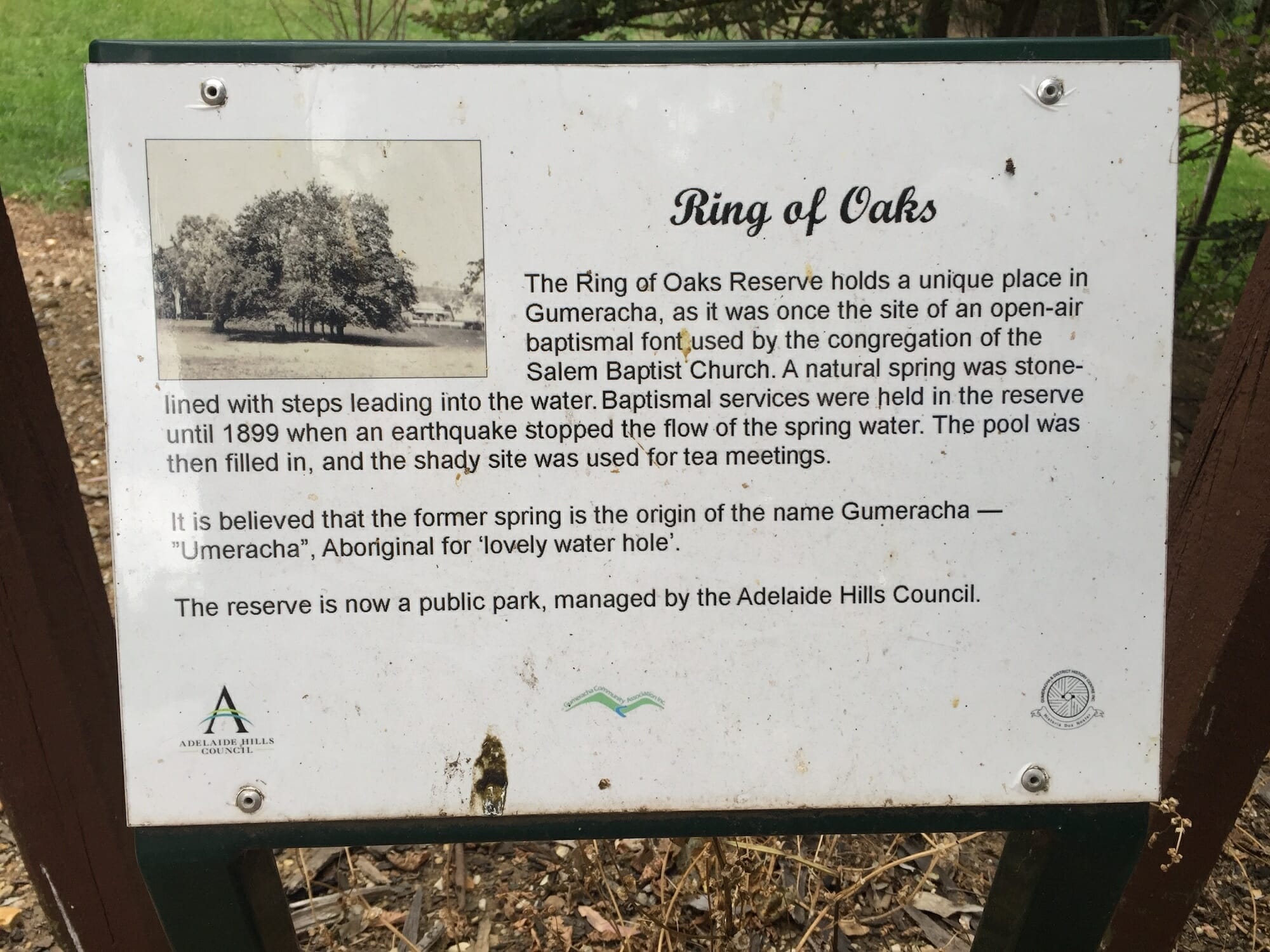 Gumeracha is a small township about 40 Kilometres East North East from Adelaide in South Australia with a population of about 700. We know the area well, as Leonie was born there and Vic’s family moved into the Forreston area just 8 Kilometres down the Williamstown Road in 1980. According to the plaque at the Ring of Oaks Reserve near the Salem Baptist Church, the origin of the name Gumeracha is from the Aboriginal word “Umeracha”, meaning “lovely water hole”. In that reserve, there was once a natural spring, until an earthquake stopped the flow of water in 1899.