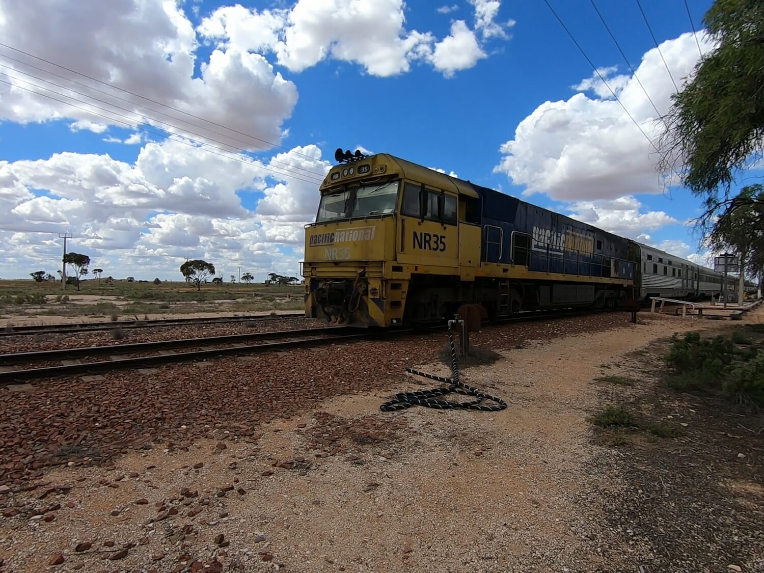 We expected the Indian Pacific that was heading west some time after lunch. But it caught us by surprise, not having the same big sound as the freight trains, so we had to scramble to get over to the track. It was the Pacific National NR35. It arrived about 13:45. We estimate a couple of hundred people disembarked and wandered around Cook for about 45 minutes, reading the information signs like we did on our arrival. We chatted to a few of them who were surprised to see us there.