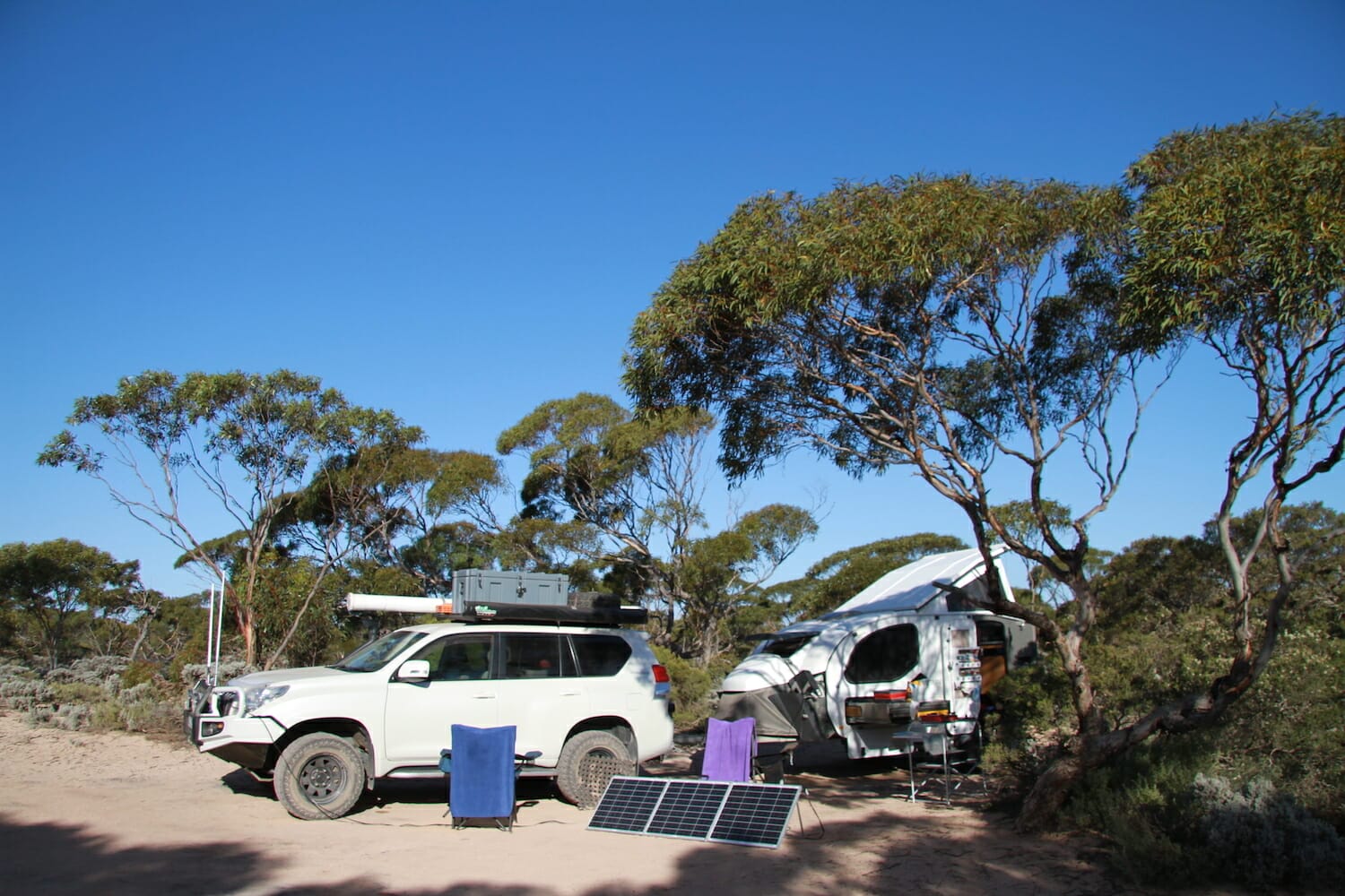 It’s called Rest Area 222km Peg, has 4 stars on WikiCamps and there are many tracks leading into the bush to tuck in to so we drove out the back onto a relatively flat sandy patch. You can just see the large sand dunes on the Great Australian Bight in the distance about 20Km away. Only a caravan and another car pulled in later near the entrance.