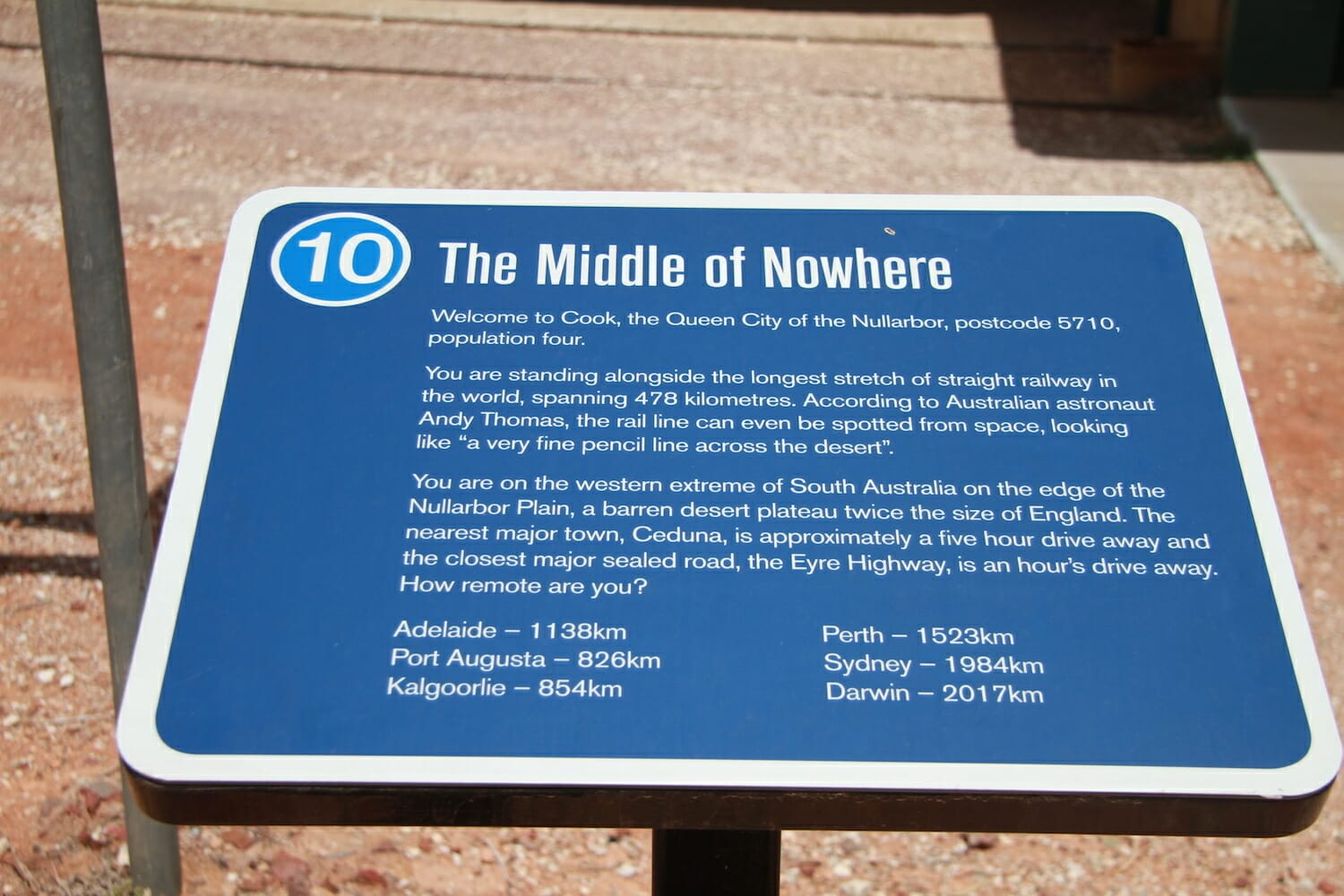 Sign #10 is titled “The Middle of Nowhere” and reads “Welcome to Cook, the Queen City of the Nullarbor, postcode 5710, population four. You are standing alongside the longest stretch of straight railway in the world, spanning 478 kilometres. According to Australian astronaut Andy Thomas, the rail line can even be spotted from space, looking like “a very fine pencil line across the desert”. You are on the western extreme of South Australia on the edge of the Nullarbor Plain, a barren desert plateau twice the size of England. The nearest major town, Ceduna, is approximately a five hour drive away and the closest major sealed road, the Eyre Highway, is an hour’s drive away. How remote are you? Adelaide – 1138km, Port Augusta – 826km, Kalgoorlie – 854km, Perth – 1523km, Sydney – 1984km, Darwin – 2017km.”