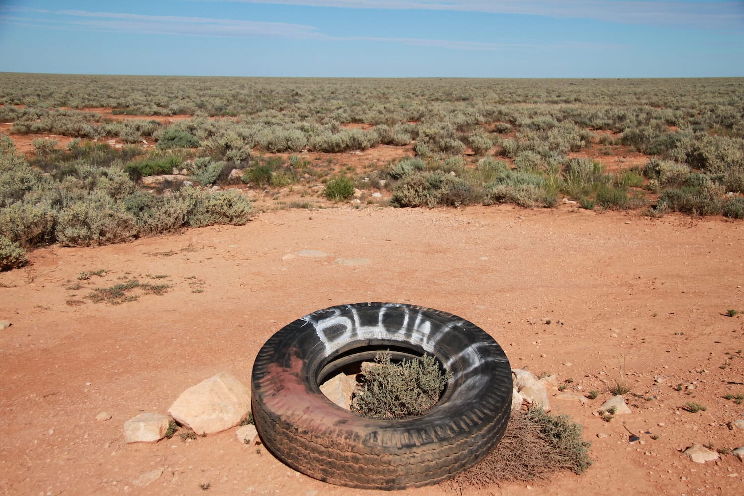 Our train spotting adventure over, we left Cook Saturday morning and headed south back to the Eyre Highway, and returned to the Nullarbor Roadhouse. Along the way we spotted an Australian bustard, or bush turkey in the saltbush and stopped to look at three birds nests in what looks like an old windmill or possibly an old trig point. There was a big black crow in one of them who wasn’t impressed by our visit who squawked and flew off. We also stopped at the Blow Hole marked with an old tyre, though there’s not that much to see apart from a hole in the ground.