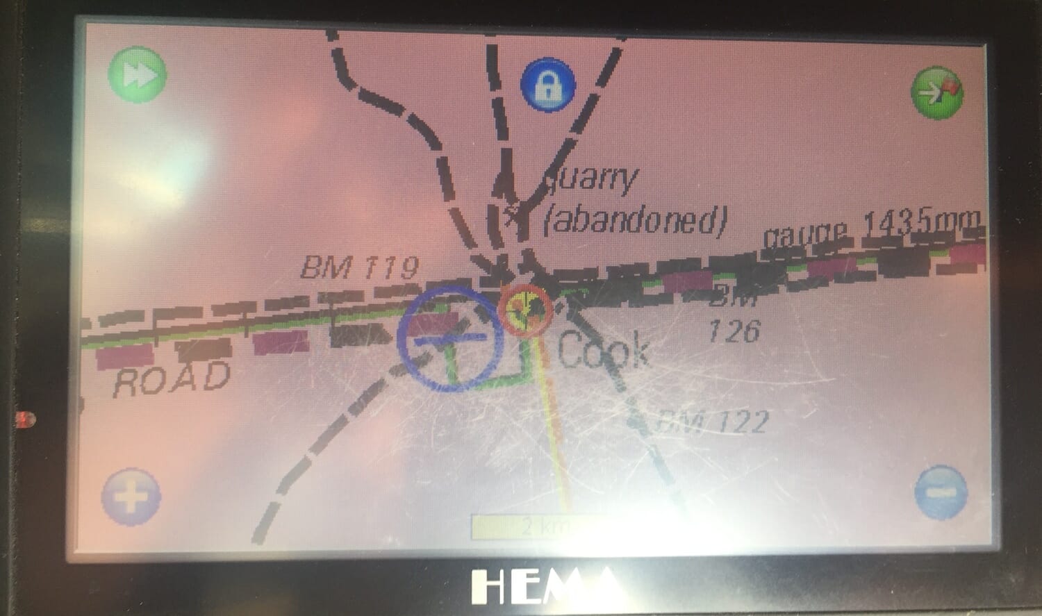 With Cook as our destination for the day, we left our roadside campsite and stopped at the Nullarbor Roadhouse to check on the road condition into Cook. The manager there didn’t know and hadn’t heard otherwise but said they’d been a lot of rain to the north. We decided to go as we could find no evidence of much rain around there, and like that was going to stop us! The price of fuel at the Roadhouse was $1.87/L. We didn’t need any as we had refuelled at Penong for $1.42/L and could do another 550Km.